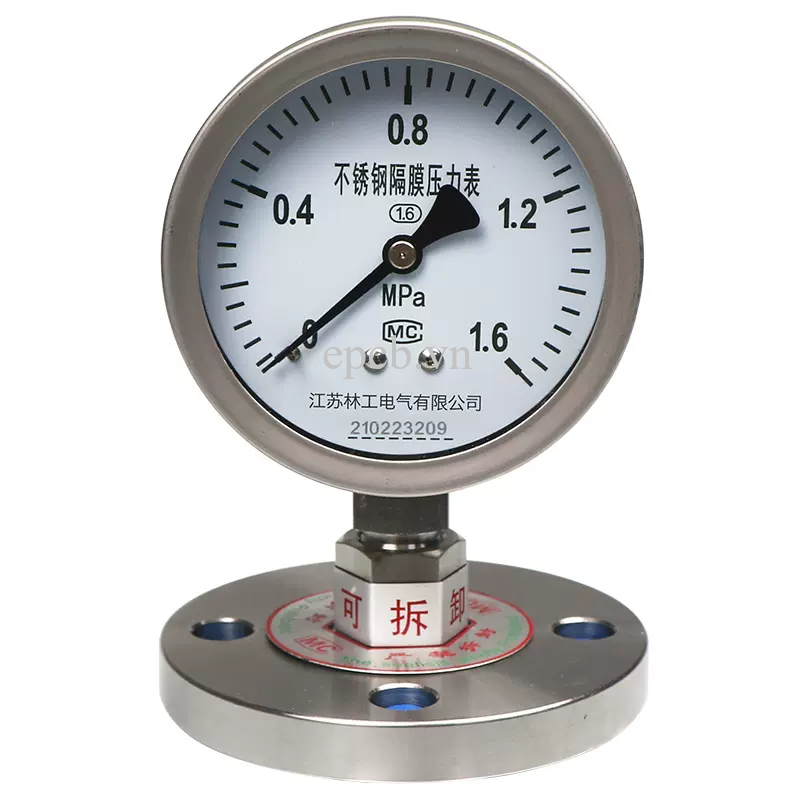 - Mặt bích được làm bằng vật liệu thép không gỉ 304( có đổi thành 316L), vật liệu màng là thép không gỉ 316L (có thể đổi các vật liệu khác: hợp kim Hastelloy, màng tantali…)