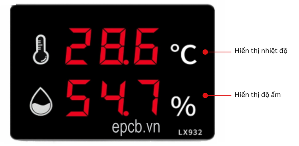 - Màn hình LED lớn: Hiển thị rõ ràng các thông số nhiệt độ và độ ẩm, giúp việc giám sát từ xa trở nên dễ dàng.