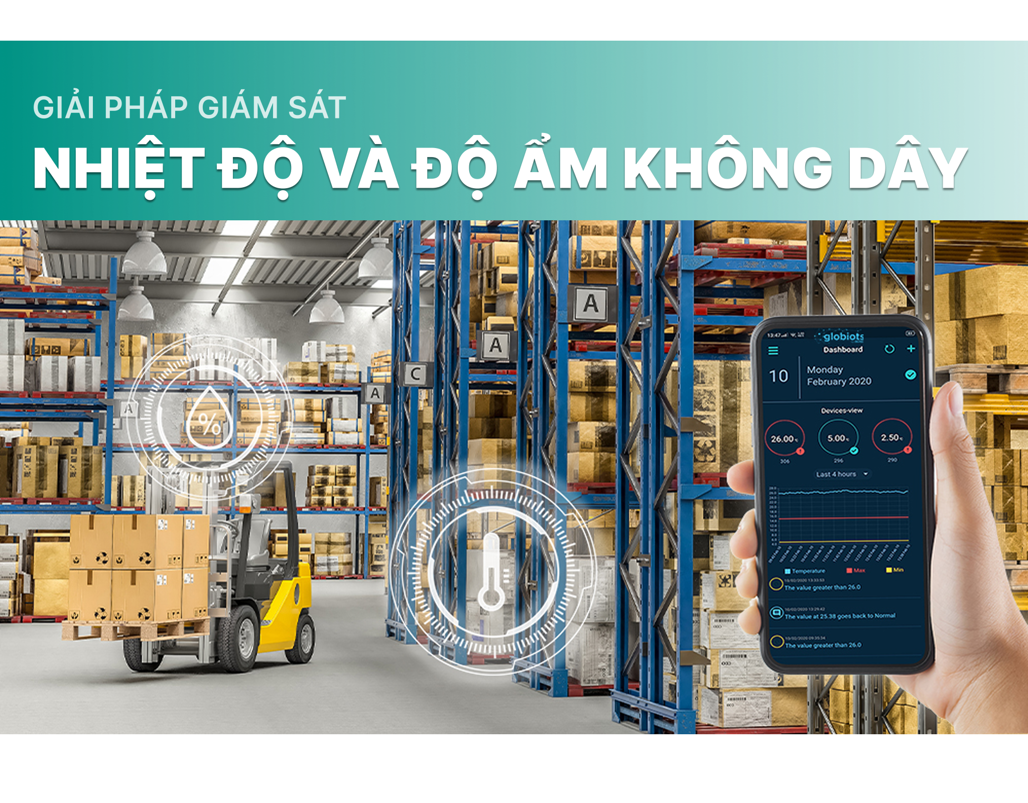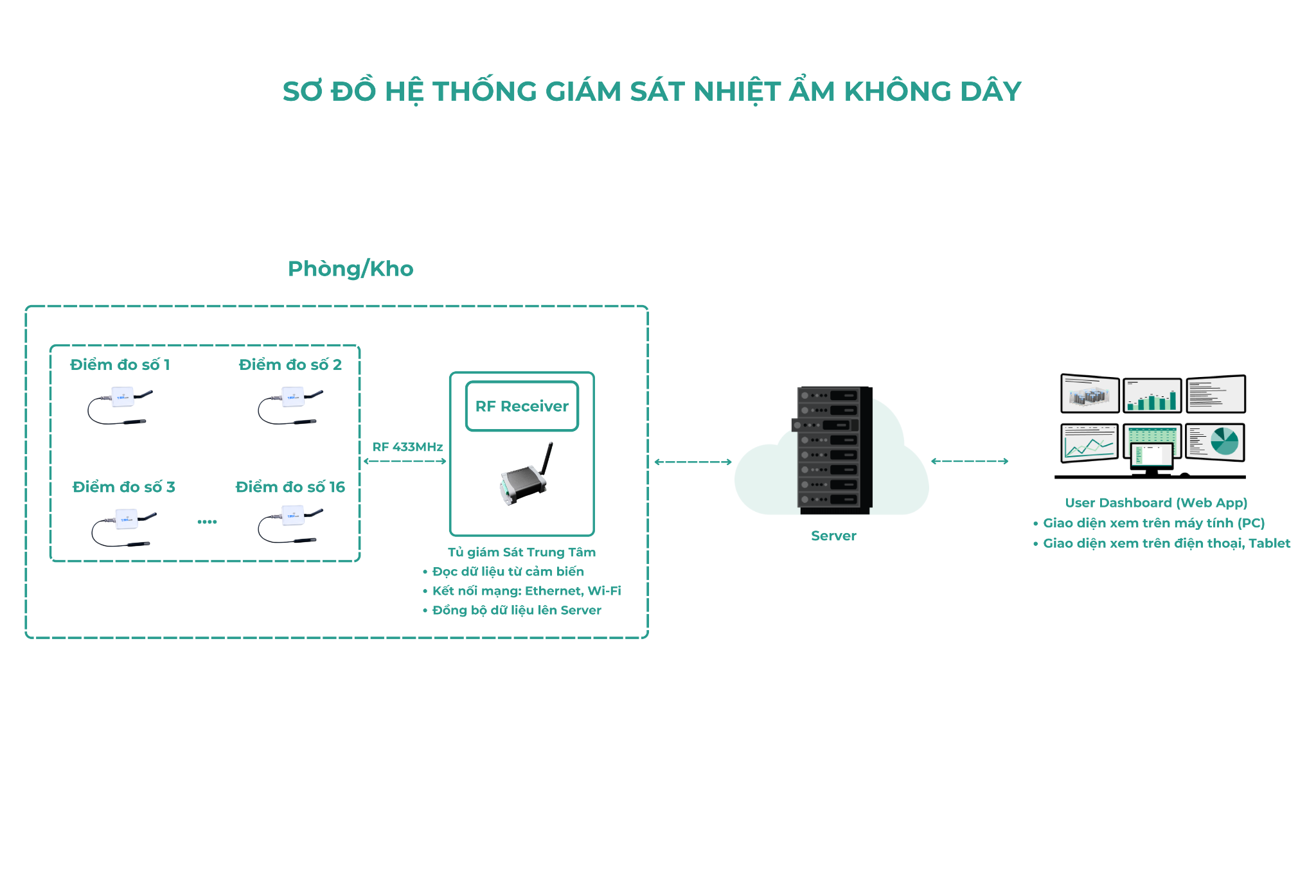 Giải pháp giám sát nhiệt độ độ ẩm không dây với sự ổn định phù hợp trong nhiều ứng dụng với đa lĩnh vực khác nhau. Với thiết kế hệ thống linh hoạt, dễ dàng triển khai lắp đặt và mở rộng, tiết kiệm thời gian và chi phí bảo trì. Kết hợp với giao diện giám sát thân thiện, tính năng thiết thực: giám sát dữ liệu theo thời gian thực, cảnh báo ngưỡng, xuất dữ liệu Excel... Giúp nâng cao hiệu suất quản lý và vận hành trong nhiều hoạt động sản xuất, bảo quản hàng hóa, nghiên cứu. Hệ thống giám sát gồm các thành phần chính: