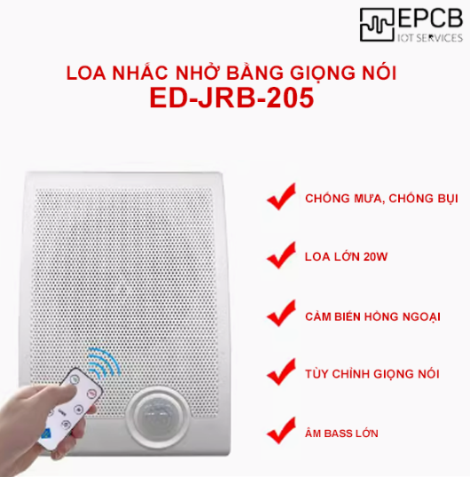 Loa nhắc nhở hồng ngoại bằng giọng nói hướng dẫn ga tàu, công trường ED-JRB-205 là giải pháp âm thanh thông minh thế hệ mới với tính ứng dụng cao, sử dụng công nghệ cảm biến hồng ngoại tiên tiến để phát hiện người. Khi có chuyển động, thiết bị tự động phát thông báo qua loa công suất lớn 20W tích hợp sẵn, đảm bảo âm thanh to và rõ ràng. Với bộ nhớ trong và cổng kết nối USB, người dùng có thể dễ dàng tùy chỉnh hoặc cập nhật nội dung âm thanh theo nhu cầu.
