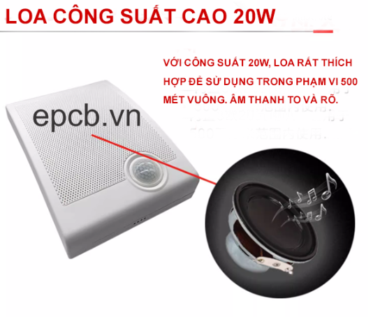 - Công suất mạnh mẽ: Loa 20W tích hợp, phạm vi phủ âm rộng lên tới 500m².